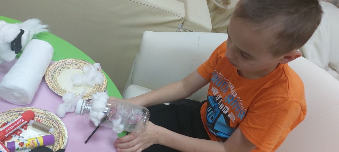 В последний месяц осени, в рамках детско-родительского занятия в клубе молодых родителей, мы создали оригинальные светильники-ночники своими руками. Обычная пластиковая бутылка из-под ряженки превратилась в очаровательную фигурку овечки благодаря простой ватной шерсти, фетровому материалу и небольшой фантазии. Внутри каждой фигуры расположилась светодиодная гирлянда, превратив игрушку в мягкий источник света, способствующий спокойному засыпанию.Затем, сидя вместе с детьми в тёплой атмосфере сенсорной комнаты, окружённые музыкой и уютом, мы послушали увлекательные истории, держа наших самодельных овечек в руках. После творческого процесса ребята смогли насладиться играми с деревянными кубиками, поучаствовать в конкурсах на развитие внимания и создать красивые осенние открытки. Таким образом, обычный ноябрьский день превратился в настоящую семейную сказку.