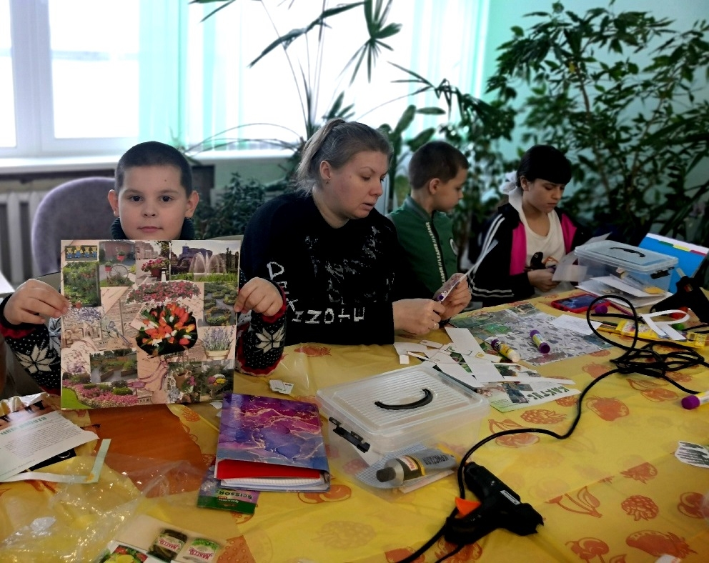 Для большей детализации участники вырезали картинки из журналов, добавляя в свои коллажи каменные дорожки и другие декоративные элементы. Это позволило сделать макеты более реалистичными и наглядными, помогая семьям лучше представить будущий сад.